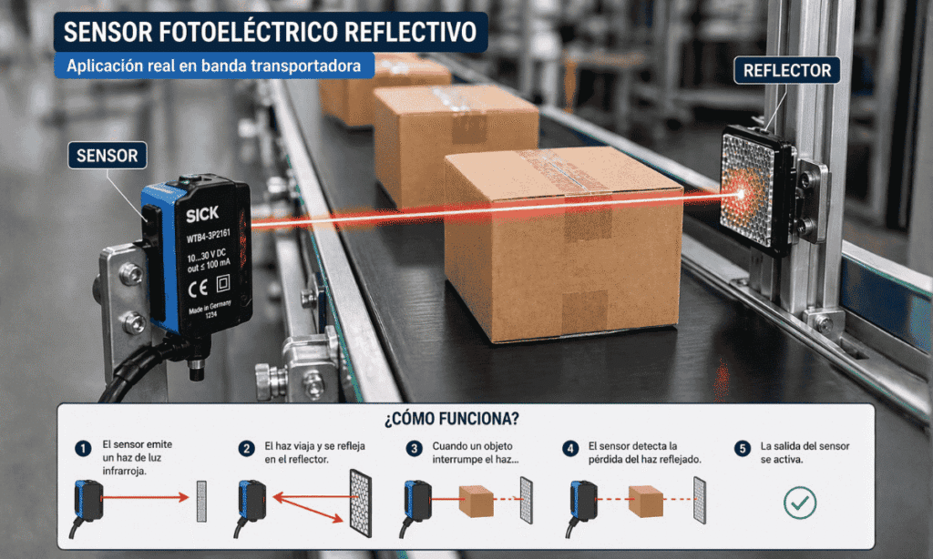 En una banda transportadora, un sensor fotoeléctrico puede detectar el paso de cajas para contarlas automáticamente o activar otro proceso.